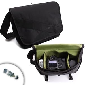 Style and Protection Your Camera DeservesStylish DesignSleek black exterior with accent "X" design on the front makes this a great camera bag for anyone! Green, scratch resistant interior easily and securely accommodates a variety of DSLR cameras. Wear the messenger camera bag on your shoulder or across your body with the adjustable strap.Durable ProtectionTwo fast opening buckles give you easy access to your camera and accessories so you never miss a shot! Durable canvass nylon construction protects your camera without adding extra weight or bulk. Comfortable and Convenient StorageFully adjustable padded walls securely accommodate your camera, lenses, flashes and other accessories, creating a custom fit. Two front pockets are ideal for securely holding any small accessories, including cables, batteries, chargers, SD cards. An additional zippered pocket offers extra secure storage for your cell phone, MP3 player and other small accessories and devices. Specifications:Interior: 11.8W x 4.7D x 8.1H in.Exterior: 13W x 5.7D x 9.4H in. Compatible With: CanonEOS-1D X / 60D / 50D / 40D / 30D / 20D / 10D / 7D / T3 / T3i / T2i / T1i / XS / XSi / XT / XTi / 600D / 1100D / 550D